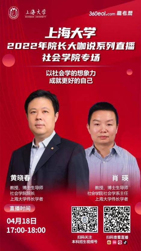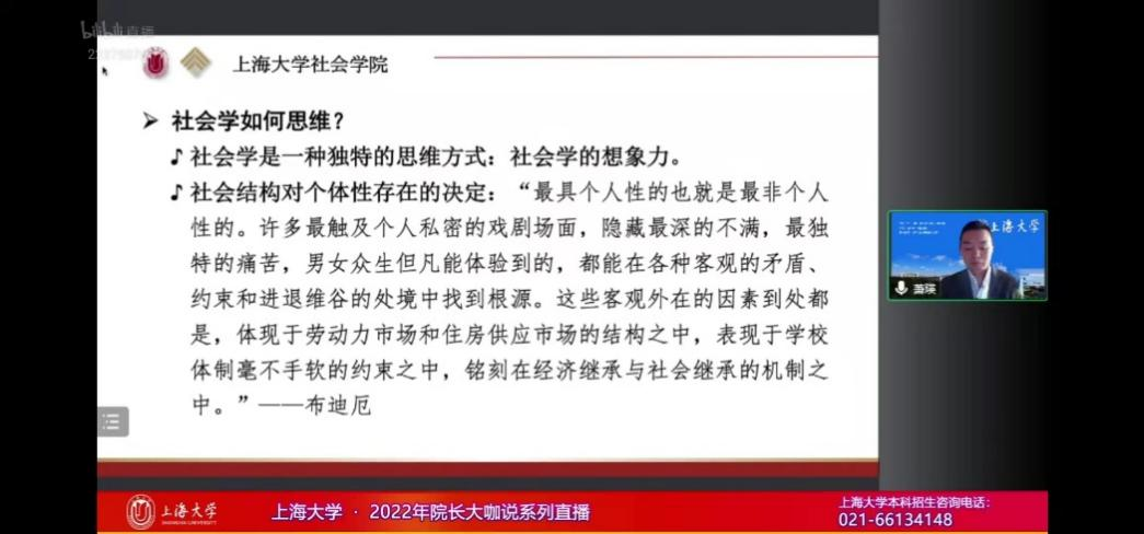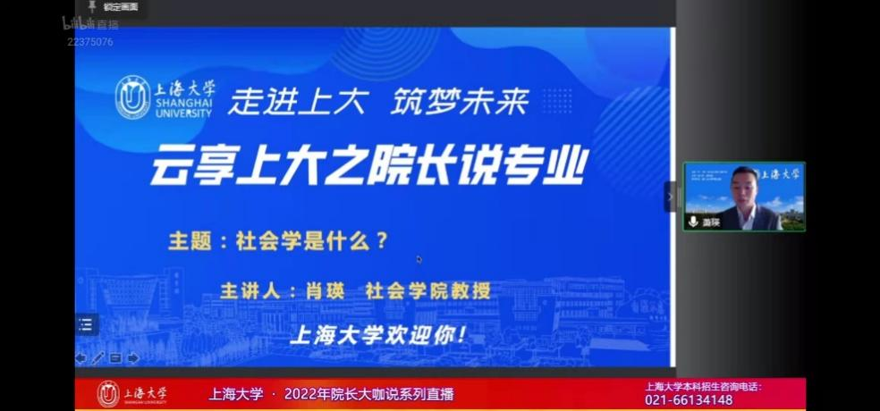 为帮助广大考生与家长进一步了解社会学学科以及学校学院概况,2022年4月18日,以360教育在线和高考帮为平台,开展“经理大咖说系列直播”太阳集团tcy8722专场宣讲会。黄晓春经理和社会学系肖瑛系主任受邀担任本次“经理大咖说系列直播”主讲嘉宾,分享主题为“以社会学的想象力成就更好的自己”。此次直播在太阳集团本科招生视频号以及多个直播平台进行播出。