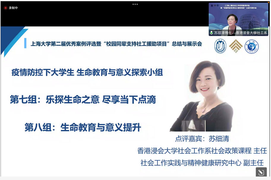第七组和第八组分别由冒婷婷同学和李烈挺同学进行汇报。香港浸会大学社会工作实践与精神健康研究中心副主任苏细青老师对这两个小组进行了点评。苏老师首先对这两个小组进行了充分肯定,同时也从主题操作性,团体动力的应用、主题的递进性、理论方面的反思性、评估方法的运用、追踪评估等方面提出了改进建议。