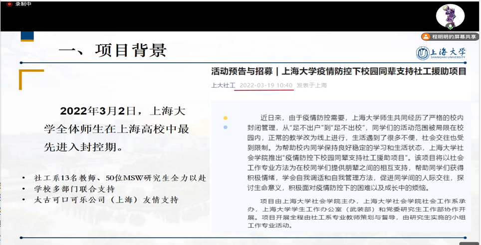 社会工作系主任程明明副教授从校园同辈支持社工援项目的背景、需求评估、标准化小组过程、评估与督导、评估过程与方法五个方面进行了详细介绍。程明明老师表示在项目推出后同学们积极响应,从3月至6月持续了4个月,覆盖全校本硕博500多人,服务时长超100小时,获得较好的今年的社工案例大赛依托项目同步进行,并希望通过案例大赛来展示项目中每个小组的风采。
