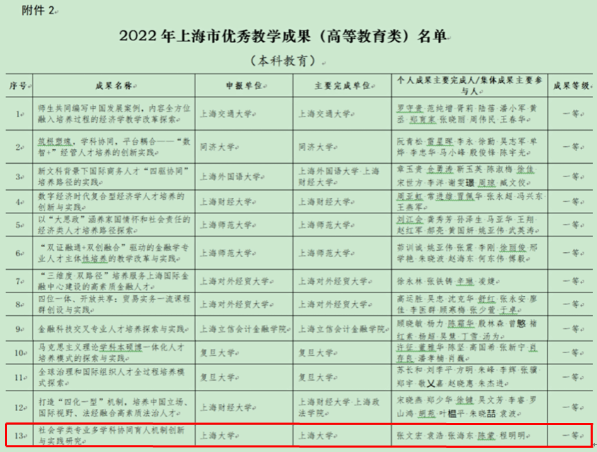 “社会学类专业多学科协同育人机制创新与实践研究”获2022年上海市教学成果一等奖