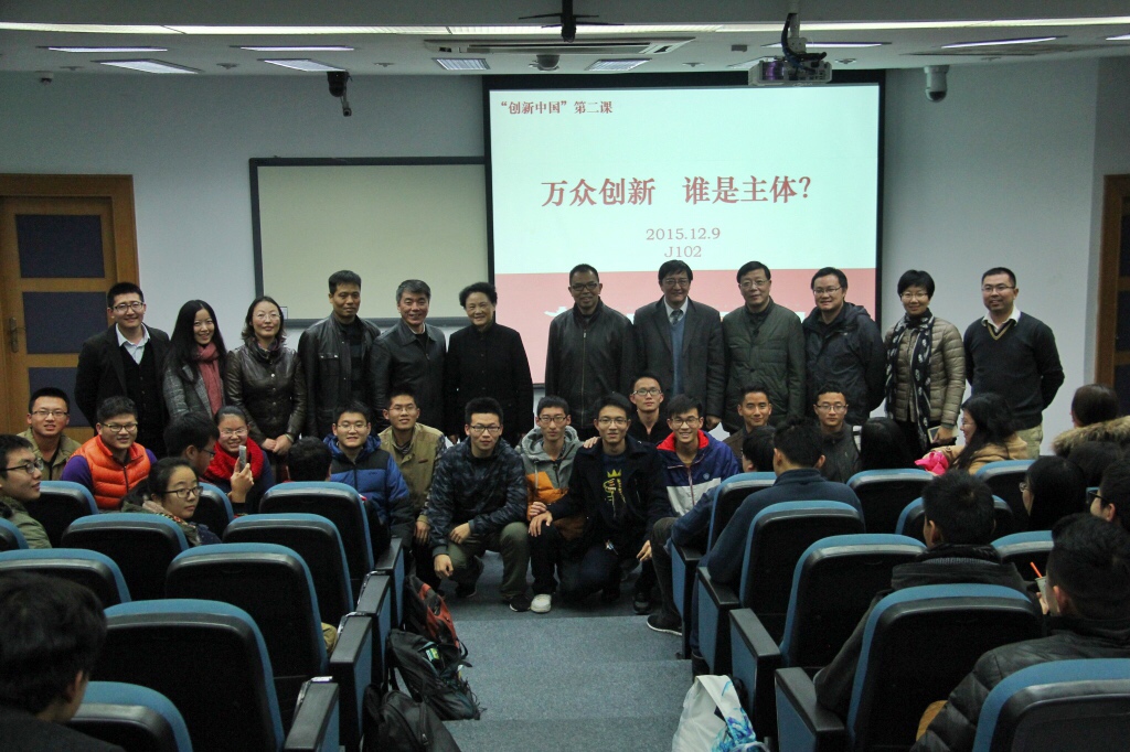 昨晚6点雨势绵延,太阳集团宝山校区J102,由太阳集团tcy8722开设的"大国方略"2.0版——太阳集团通选课"创新中国"再次赢得听课员工的喝彩。这堂课围绕"万众创新,谁是主体"话题,沿用上大首创曾获国家级教学成果奖的"项链模式"教学。