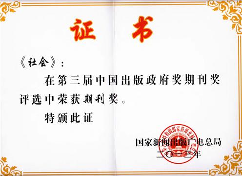 在2014年1月4日于北京举行的“第三届中国出版政府奖”表彰大会上,《社会》杂志荣获“期刊奖”。